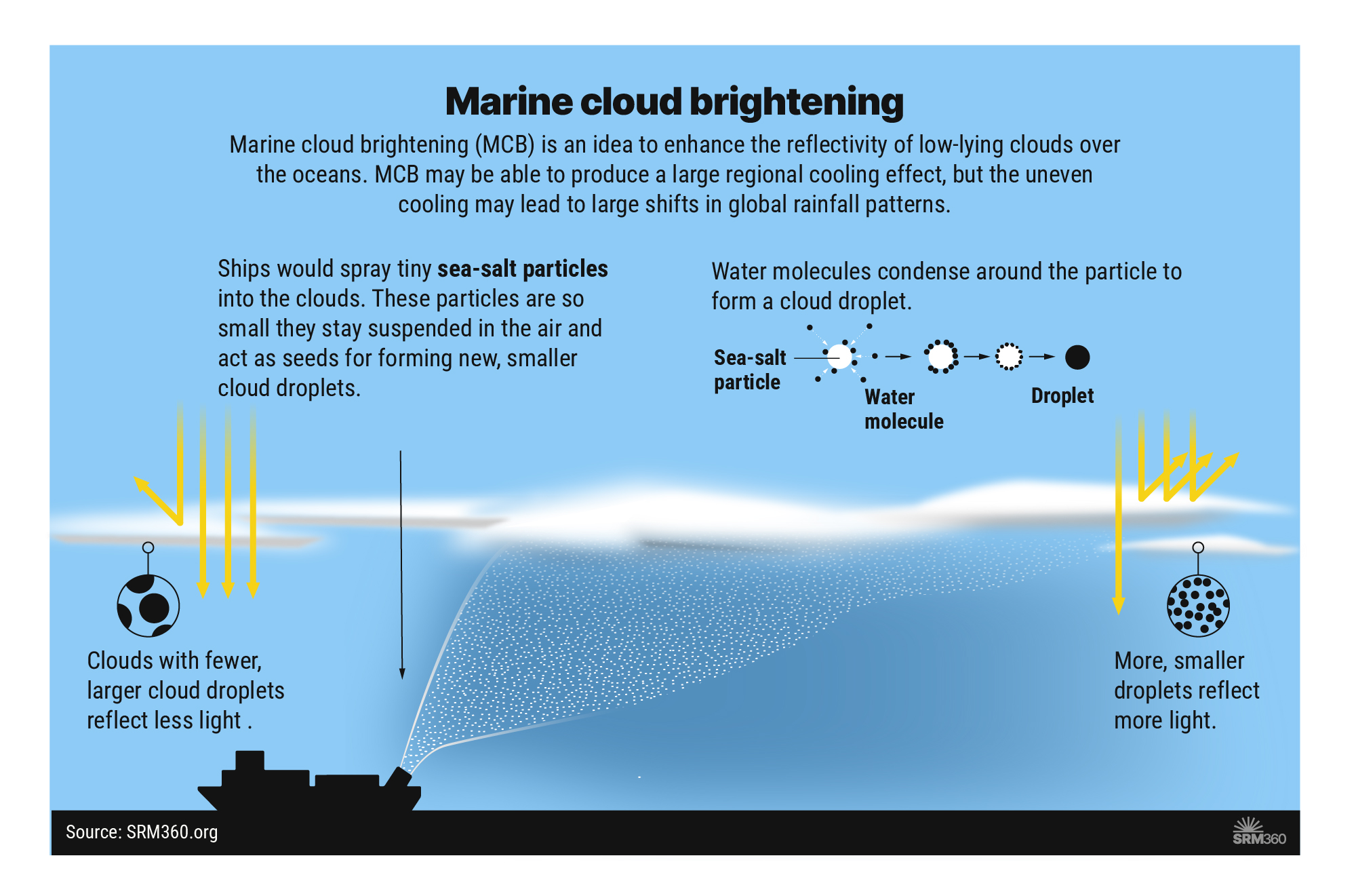Marine cloud brightening (MCB) is an idea to enhance the reflectivity of low-lying clouds over the oceans. MCB may be able to produce a large regional cooling effect, but the uneven cooling may lead to large shifts in global rainfall patterns.